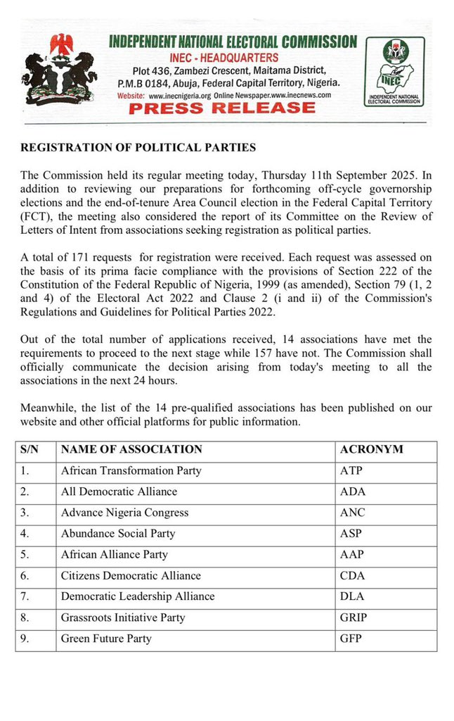 INEC has also invited interim chairmen and secretaries of the shortlisted groups to a crucial briefing on September 17, 2025, at its Abuja headquarters.