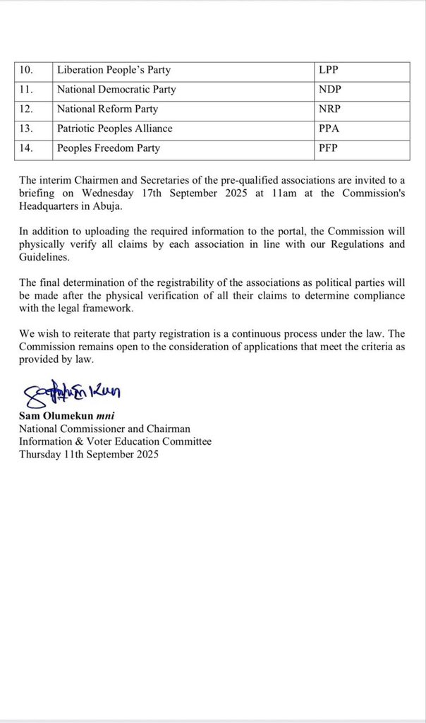 INEC has also invited interim chairmen and secretaries of the shortlisted groups to a crucial briefing on September 17, 2025, at its Abuja headquarters.